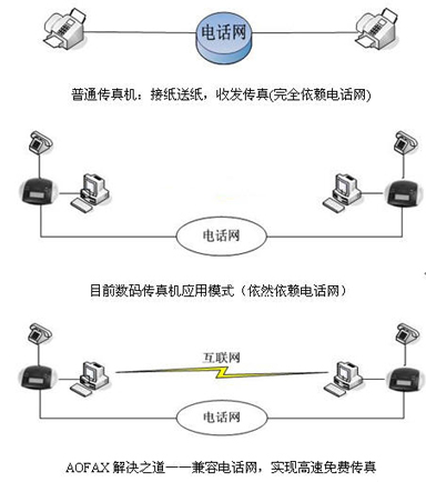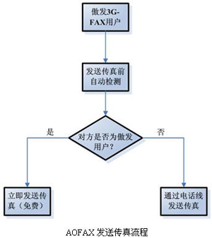 免费传真是怎么实现的?傲发3G-FAX在发送传真前会自动检测对方是否为AOFAX用户,如果是,立即发送;如果不是,通过电话线发送。