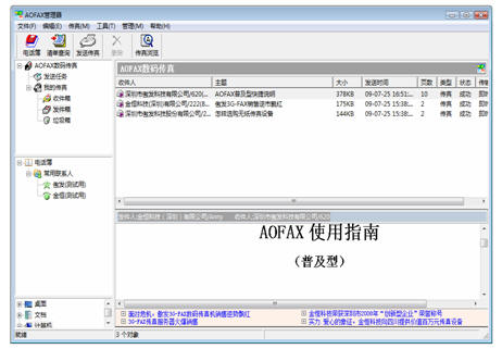 双击桌面上的“AOFAX传真管理器”,按照提示在“本地”页面填写基本信息,在“即时传真”页面填写已申请的傲发号和密码。点击确定,进入“AOFAX管理器”界面(如下图所示),同时右下角的传真机图标底色变绿,表示已正确设置免费传真。