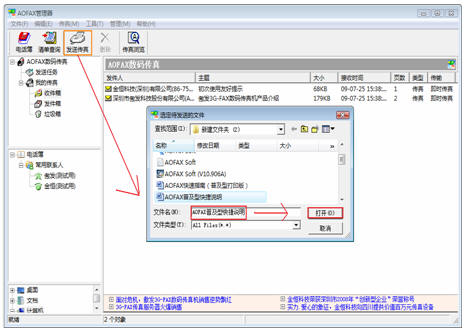 点击“发送传真”,选择要发送的文件。电脑里只要能打印的文件,AOFAX传真软件都能进行发送,如:Word、Excel、Tif、Pdf等。