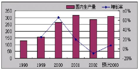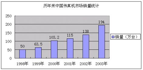从产销量情况的增长态势来看,传真机市场从1998年开始一直处于一种扩大的趋势之下。销量在五年内增长速度达到将近三倍,并且由于产品销量增长幅度大大超过价格下降幅度,所以整个市场销售额正逐步扩大。