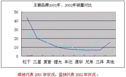 2001年各大品牌市场销量和市场占有率状况对比如下: