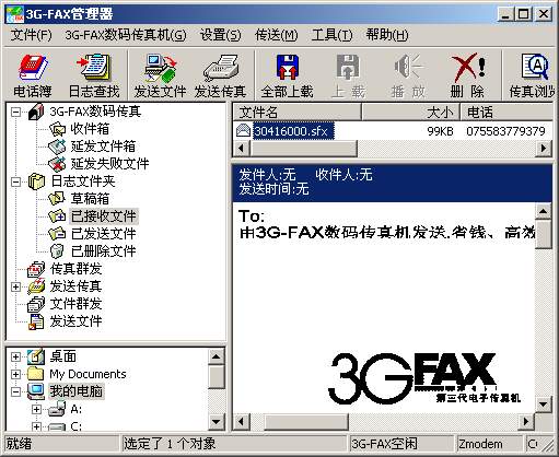 3G-FAX操作简单,无需上网、不用账号,象发送传真一样发送Word、Excel、彩图、声音等电子文件,只需拖一下文件即刻到达对方;
