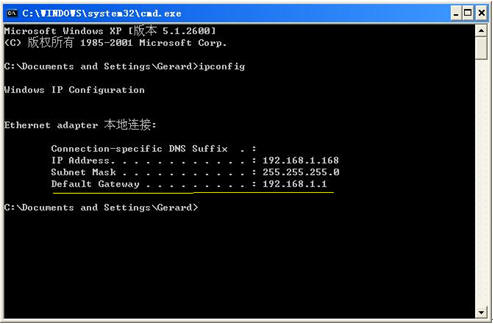 在连接3G-FAX服务器端的电脑上,在任务栏中选择开始-运行,填写cmd 回车,弹出窗口如下图,填写ipconfig 回车,图中显示的Default Gateway 即为默认网关地址,图中显示的IP Address即为3G-FAX服务器端电脑IP地址。